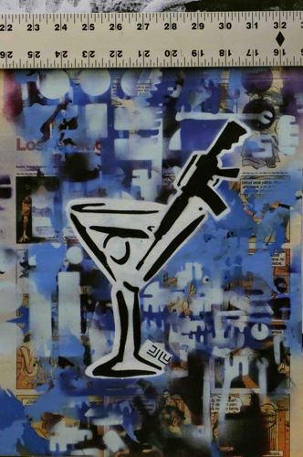 This contemporary mixed-media artwork features a central, bold stencil of a martini glass containing an AK-47 style rifle instead of a garnish. The central icon is rendered in stark black lines with a white halo effect, positioned against a chaotic, layered background. The base layer appears to be a collage of printed materials, including comic book panels and newspaper clippings (notably featuring the text 'Los...'). Over this collage, layers of blue and black spray paint have been applied using various stenciling techniques, creating a street-art aesthetic. The color palette is dominated by cerulean blue, black, and white over the aged yellow of the newsprint. A small, stylized square geometric monogram signature is visible near the base of the martini glass. Based on the 2224 x 3353 resolution and the presence of a ruler at the top (marking approximately 11 inches of width in view), the piece is likely a vertical format work on paper or wood panel. The style is indicative of early 21st-century urban pop art, likely created within the last 10–15 years. The condition appears fair, with intentional 'distressed' elements typical of the medium; however, the paper backing shows minor rippling and edge wear consistent with a non-archival mounting or storage.