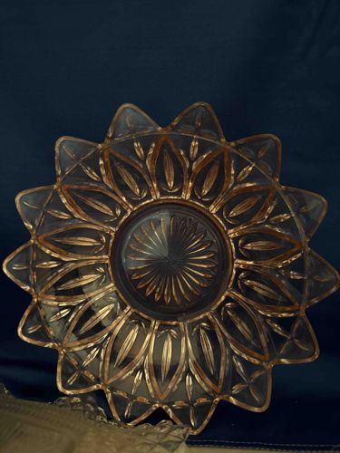 This is a circular, shallow glass bowl exhibiting an iridescent marigold carnival glass finish. The bowl features a distinct 12-point scalloped starburst or 'petaled' rim, where each point corresponds to a pressed glass pattern of elongated lancet arches that radiate from the center. These arches contain a central line resembling a leaf vein or wheat stalk. The center of the basin features a sunburst or star-cut pattern with fine radial lines. The overall color is a warm, orange-gold 'marigold' tone achieved through a liquid metallic spray during the manufacturing process, giving it its characteristic iridescence. Based on the style and molded construction, this item appears to be an example of mass-produced American carnival glass, likely dating between 1910 and 1930. The craftsmanship shows typical characteristics of pressed glass from this era, including sharp mold lines and consistent patterning. The bowl's condition appears fair to good: there is visible wear on the iridescent coating, particularly along the raised edges of the scallops and the internal pressed pattern, where the underlying clear glass is more apparent. There are no large chips or cracks visible in the image, but scattered fine surface scratches suggest use over time. This style is consistent with manufacturers like Federal Glass or Indiana Glass, who produced various 'Sunburst' and floral-inspired patterns for domestic use.