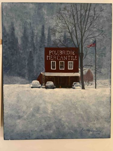 Polebridge Mercantile Winter Scene Oil Painting by Karen Thorne