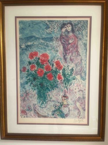 This item is a framed color lithograph attributed to the style of Marc Chagall, likely a mid-to-late 20th-century print. The artwork depicts a signature Surrealist/Modernist scene featuring a celestial-like couple embracing in the upper right quadrant, hovering above a large, vibrant bouquet of red flowers in a green vase. The composition is set against a dreamy, ethereal background of blue and white washes suggesting a village under a moonlit or twilight sky. The piece is rendered in a soft, gestural style with a palette dominated by primary reds, deep blues, and leafy greens. It is housed in a contemporary gilded wood frame with a double-matted border (a wide white outer mat and a thin dark inner fillet). The artwork features a signature in the lower right-hand corner, which appears to be a facsimile or hand-pencil signature of Marc Chagall, and there is a faint numbering or notation in the lower left corner, typical of limited-edition prints. The condition appears fair to good; while the print colors remain relatively vibrant, there is some visible rippling or 'cockling' of the paper inside the frame, suggesting potential exposure to humidity or improper mounting. No significant staining or foxing is immediately visible through the glass, though the frame shows minor shelf wear on the gilding.