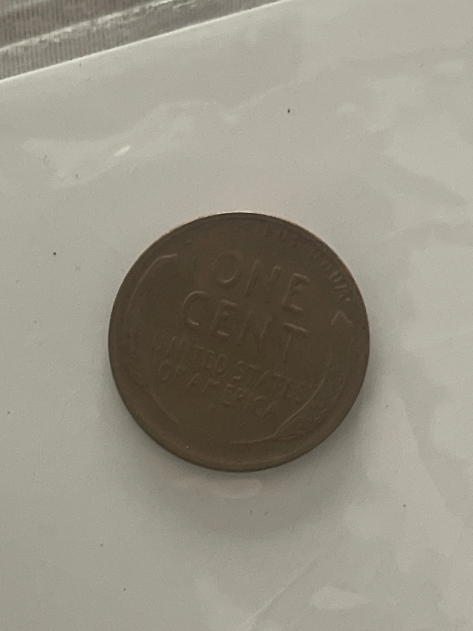 This item is the reverse side of a United States one-cent coin, commonly known as a 'Wheat Cent' or 'Wheat Penny.' This specific design was produced by the U.S. Mint between 1909 and 1958. The reverse features the denomination 'ONE CENT' in large, bold font in the center, with 'UNITED STATES OF AMERICA' inscribed directly below it. Framing these central inscriptions are two stylized stalks of wheat along the left and right rims, which gave the coin its nickname. At the top curvature, the national motto 'E PLURIBUS UNUM' is visible. Although the provided context mentions '1 ounce silver,' this imagery is characteristic of a standard copper-alloy penny (95% copper, 5% tin/zinc). The coin displays a significant dark brown patina consistent with long-term circulation and oxidation of copper. The condition appears to be 'Good' to 'Very Good' in numismatic terms; the lettering remains legible, but the finer details of the wheat lines and the rims show substantial wear and flattening. There are no immediate visible mint marks (which appear on the obverse) or rare error indicators in this view. The craftsmanship reflects the classic Victor David Brenner design, representing a mid-20th-century American currency staple.