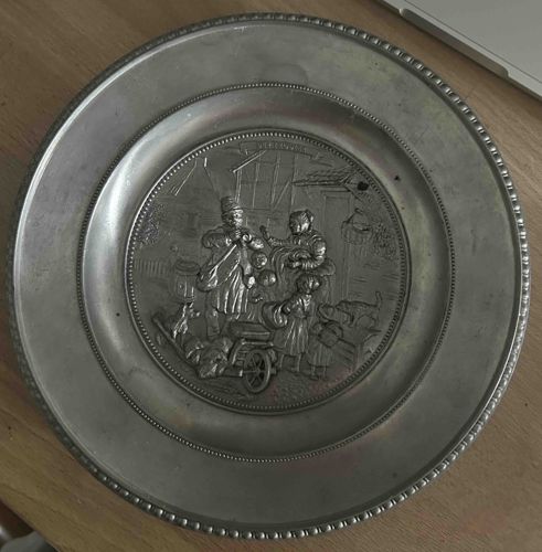 This is a circular decorative plate made of pewter, likely of European (possibly Dutch or German) origin, following the traditional style of 20th-century commemorative metalware. The plate features a wide, flat rim decorated with a beaded or 'gadroon' edge. The center well is deeply embossed with a detailed narrative scene depicting a village tableau, likely representational of a historical trade or town activity. Characters in period-style clothing are visible, including a man with a cart, a woman, and children near a timber-framed building. The metal exhibits a dull, leaden gray patina characteristic of aged pewter, with visible surface oxidation and localized darkening. Construction is likely sand-cast or pressed, with the high-relief central medallion showing significant depth. Notable condition issues include minor surface scratching, small dark spots (pitting) consistent with environmental exposure, and a slight unevenness in the rim's curvature. Above the central scene, there is a small rectangular cartouche which typically would contain a name or date, though the text appears worn or faded. The craftsmanship reflects mid-tier industrial reproduction of classic 17th or 18th-century forms, commonly used as souvenir wall hangings or display cabinet pieces.