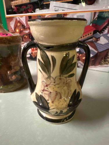 This is a small-to-medium sized ceramic vase featuring a double-handled amphora-style silhouette. The piece is constructed from earthenware or stoneware with a cream-colored base glaze. It showcases hand-painted floral motifs, specifically a central rose or peony in pale pink and yellow hues, framed by dark green foliate patterns. The handles and rim are accented with a dark charcoal or deep forest green glaze, providing a sharp contrast to the lighter body. This item is characteristic of Japanese export 'Occupied Japan' or post-WWII pottery, typically dating from the late 1940s to the 1950s. The craftsmanship is utilitarian yet charming, with visible brushstrokes and slight glaze irregularities that indicate hand-decoration. The condition shows minor signs of age-related wear, including some light crazing in the glaze and small surface scuffs consistent with its vintage status. There are no large chips or structural repairs visible in the primary view. The form features a flared collar, a tapered neck, and a bulbous body resting on a circular footed base. The handles are simple C-curves that merge into the shoulder and neck, typical of the mid-century Japanese aesthetic for domestic exports.