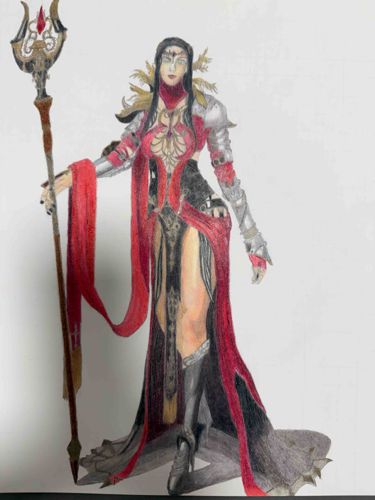 This item is an original hand-drawn illustration depicting a female fantasy character, likely a mage or sorceress. The artwork is composed on a white paper substrate using a combination of colored pencils and possibly fine-liners for detailing. The character stands in a powerful pose, holding a tall, ornate staff topped with a red gem and gold-toned metalwork. Her attire is complex, blending elements of high-fantasy armor and silken robes in a palette of deep crimson, charcoal black, and metallic silver. Notable features include intricate filigree on the chest piece, silver pauldrons (shoulder armor) over-layered with tattered golden-brown plumage, and a flowing red sash draped over her arm. The rendering exhibits significant craftsmanship, particularly in the shading of the fabric folds and the application of metallic highlights on the gauntlets. The figure has long dark hair and wears a delicate silver headpiece. The condition appears to be excellent with no visible tears or foxing on the paper, though there are subtle variations in color saturation suggestive of manual pencil layering. The style is contemporary, drawing inspiration from modern video game concept art or tabletop gaming illustrations.