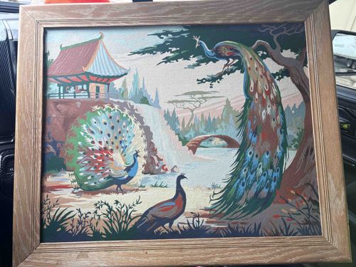 Mid-Century Vintage Paint-By-Number Asian Garden Scene with Peacocks