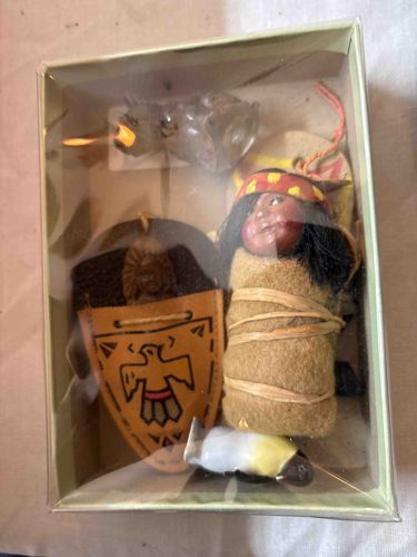 This is a vintage multi-piece souvenir diorama set housed in its original clear-lidded display box. The collection features several miniature items designed to represent Native American culture, likely produced as mid-century tourist merchandise. Central to the set is a papoose figure featuring a painted composition or plastic face with black synthetic hair, wrapped in a tan felt or buckskin-style textile bound with raffia cord. Accompanying the figure is a small leather-style shield or pouch decorated with a hand-painted or stamped thunderbird motif in black and red, showing primitive geometric borders. The set also includes a small ceramic or composition animal figure, possibly a skunk or badger, and a miniature leather medallion featuring a chief in profile. The materials include felt, raffia, synthetic hair, molded plastic/composition, and thin leather or faux-leather. The condition appears fair to good for its age, though the clear plastic lid shows some scuffing and clouding, and the internal mounting shows signs of displacement. This type of folk-art-inspired kitsch was common in North American roadside gift shops between the 1950s and 1970s.