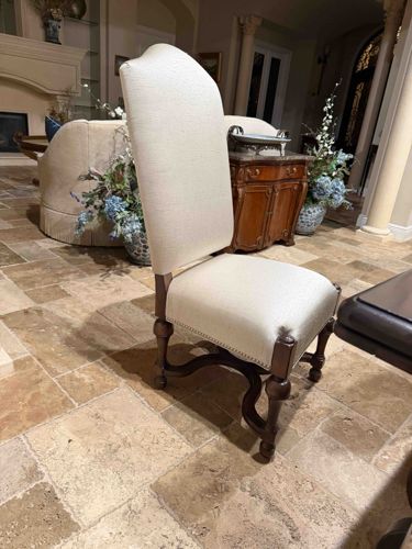 This side chair features a distinctive high, tapered back with a slight camelback crest, fully upholstered in a light cream or off-white woven textile. The seat is also fully upholstered, accented by a neat row of nailhead trim along the base of the frame, indicating meticulous craftsmanship. The exposed wooden frame is crafted from a dark, rich wood—likely mahogany or walnut—with a warm brown finish. The support structure is notable for its ornate, bulbous turned legs at the front, transitioning into a curved, H-shaped stretcher system that provides both stability and aesthetic flair. The rear legs are slightly flared, characteristic of a transitional style that blends traditional Queen Anne or William and Mary influences with contemporary proportions. The item appears to be in excellent condition with no visible staining on the fabric, no significant fraying, and a well-maintained polished wood finish showing minimal signs of wear. The construction suggests a high-quality modern manufacture designed to mimic 18th-century European silhouettes while providing modern comfort levels.
