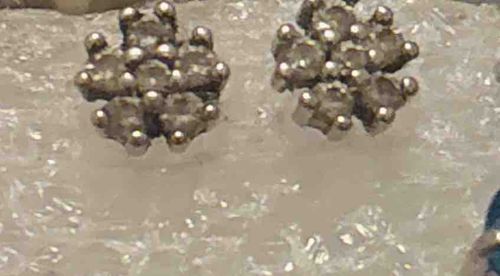 This is a pair of flower-shaped cluster stud earrings, consisting of seven round-cut colorless stones arranged in a floral pattern. Each earring features a central stone surrounded by a 'petal' ring of six additional stones. The stones are secured using a traditional prong-setting technique, with multiple rounded metal beads visible that hold each stone in place. The metal appears to be a silver-toned alloy, which could be sterling silver, white gold, or costume metal with rhodium plating; visible oxidation and small surface abrasions are present, suggesting moderate age and wear. The stones exhibit a milky or inclusions-rich appearance under magnification, characteristic of lower-grade diamonds or synthetic simulants like cubic zirconia. There are no visible maker's marks or hallmarks in the provided image. The style is a classic botanical design popular since the mid-20th century. The craftsmanship is functional, with the cluster design intended to maximize surface area sparkle while using smaller individual stones. Condition-wise, the earrings show slight grime accumulation around the settings and minor dulling of the metal's high-polish finish.