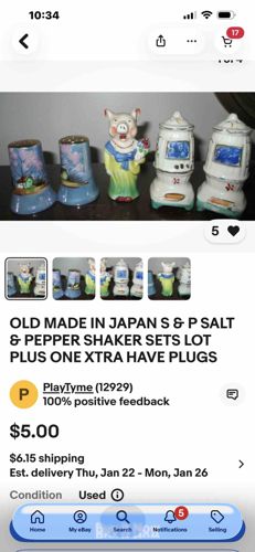 This lot contains five individual ceramic pieces comprising two full sets and one additional anthropomorphic shaker. The first set features a tall, tapered cylindrical form decorated with a scenic landscape including a small cottage and cherry blossom trees on a blue background. The second set consists of two white kitchen stove-shaped shakers accented with blue, gold, and green hand-painted details. The fifth piece is an anthropomorphic female pig figurine dressed in a blue scarf and yellow skirt, holding a small bouquet. All items are crafted from glazed ceramic, likely earthenware or porcelain. These shakers are characterized by their mid-century 'novelty' style, common among Japan's post-WWII exports (circa 1940s-1950s). The craftsmanship is characteristic of mass-produced decorative export ware, featuring hand-painted cold-paint accents and gilding that often show wear over time. The condition appears consistent with age, showing visible 'cold paint' loss on the pig and stove pieces, and potential light crazing in the glaze. The bases likely contain cork or rubber stoppers as described in the original advertisement. The presence of 'Occipied Japan' or basic 'Made in Japan' stamps are expected on the undersides of such items.