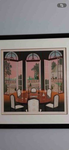 This item is a framed lithographic print depicting a highly stylized, symmetrical Art Deco interior scene. The composition features an elegant dining room with a round polished mahogany-toned table at the center, surrounded by five high-backed white chairs with dark piping. Upon the table rests a decanter, glassware, and two tall, slender black candelabra. The room opens through three large arched French windows/doors onto a manicured garden landscape under a pink and lavender evening sky. The color palette is sophisticated, utilizing deep forest greens, terracotta oranges, and soft pastels. The print is characterized by clean lines, flat planes of color, and geometric precision, which are hallmarks of the late 20th-century revival of the Art Deco aesthetic. The artwork is housed behind glass in a simple black modern frame with an off-white mat board. There appear to be some small notations or a signature in the lower left and right margins of the print paper, though they are not legible at this resolution. The condition appears excellent with no visible foxing, sun-fading, or moisture damage to the paper or mat. The framing is functional and contemporary, likely dating the piece to the 1980s or 1990s.
