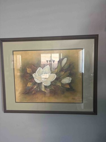 This is a large-format framed artwork depicting a white magnolia blossom. The central motif features a fully opened white magnolia flower surrounded by green and brownish leaves, along with two closed buds. The color palette is earthy and warm, utilizing ochre, deep greens, and sepia tones for the background and foliage, which creates a soft, hazy atmosphere around the crisp white of the petals. The primary material appears to be a lithographic or offset print on paper, protected by glass. The artwork is professionally matted with a dual-layered sage green and dark brown mat board and housed in a dark wood or composite frame with a simple, classic profile. The craftsmanship suggests a commercial quality typical of late 20th-century home decor (circa 1980s-1990s). There is a visible inscription or signature in the lower right corner, though it is slightly obscured by glares. Regarding condition, the frame shows minor edge wear, and there is significant glare on the glass surface indicating it is standard rather than museum-grade non-reflective glass. The matting appears intact without visible signs of water damage or acid staining, though the backing would need inspection to confirm archival quality.