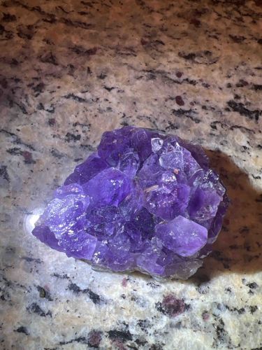 This specimen is a raw amethyst quartz cluster, characterized by its vibrant purple hue ranging from deep violet to lighter lavender tones. The piece consists of a dense grouping of natural, interlocking crystalline points emerging from a common matrix base. The crystals exhibit the typical hexagonal prism structure of quartz, though many of the terminations appear fractured or naturally irregular. The material displays high transparency in several sections, allowing light to penetrate the crystal geometry, while other areas are more opaque with internal inclusions and veining. The exterior facets show a vitreous luster that catches the light across the uneven surface. In terms of condition, the specimen appears largely in its natural state, showing some edge wear and minor chipping along the crystal points, which is common for geological samples handled outside of professional museum settings. There are no apparent artificial modifications or dye treatments visible, suggesting a natural origin. The base of the cluster shows a grayish, stony matrix characteristic of the geode walls where such crystals typically form. The overall craftsmanship is dictated by nature, with the value being determined by the saturation of color, the size of individual points, and the overall aesthetic balance of the cluster.