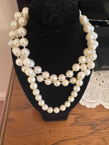 This is a classic three-strand necklace featuring graduated simulated (faux) pearls, displayed on a black velvet jewelry bust. The necklace consists of individual spherical beads with an iridescent, creamy-white luster, designed to mimic natural saltwater pearls. The beads are hand-knotted on a silken cord, as evidenced by the visible knots between each pearl, which is a quality indicator that prevents the beads from rubbing against one another and ensures they do not scatter if the strand breaks. The pearls appear to range in diameter from approximately 6mm near the clasp area to about 10mm at the focal center. The construction suggests a mid-20th-century vintage style, likely from the 1950s or 1960s, a period synonymous with multi-strand costume jewelry popularized by brands like Monet or Trifari. In terms of condition, the pearls show consistent surface luster, though close inspection reveals subtle variations in the nacre coating characteristic of faux pearls. No significant peeling, deep scratches, or discoloration is immediately visible in the image, though the stringing appears taut, suggesting it may have been restrung or well-preserved. The clasp is not visible, but the drape indicates a graduated lengths for each strand to prevent tangling.