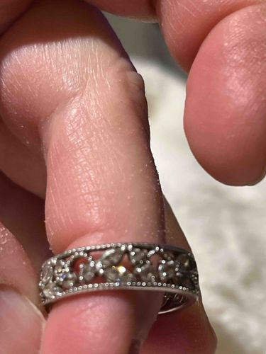 This piece is a decorative sterling silver or white gold eternity-style band featuring an intricate openwork filigree design. The ring is approximately 4-6mm in width and is constructed with a continuous floral and leaf pattern. The metalwork is characterized by delicate milgrain edging along the top and bottom borders, providing a textured, beaded finish typical of Art Deco-inspired jewelry. Internally, the design consists of alternating round-cut and marquise-cut clear stones, likely cubic zirconia based on the setting style, though they could be small diamonds or white sapphires. The stones are prong-set within the scrolling vine-like filigree. In terms of condition, the ring shows signs of light wear with minor surface scratches on the metal borders and some dulling of the pavé-set stones due to skin oils and debris, which is common for pre-owned jewelry. There are no visible hallmark stamps or maker's marks from this angle, but the craftsmanship suggests a contemporary commercial manufacture designed to mimic early 20th-century aesthetics. The overall construction is solid with no apparent missing stones or structural deformities in the band's circularity.