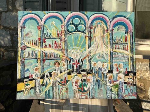 This is an original large-scale painting measuring 100x80cm, created by the artist Dale Haessly. The work is executed in an expressive, impasto style using what appears to be acrylic or oil paint on a stretched canvas. The composition features a vibrant, light-filled interior, possibly a celestial tavern or apothecary, structured by five large arched windows or niches. These architectural elements are outlined in thick, gestural strokes of pink, blue, and white. Within these arches, various figures, some appearing angelic with halos, are depicted in a loose, figurative manner. The central figure stands with arms outstretched beneath a radiant sunburst and a trefoil window design. The color palette is dominated by a bright turquoise background, accented with primary reds, yellows, and heavy applications of white highlights to suggest shimmering light. The application of paint is energetic and textured, showing visible brushstrokes and palette knife marks that create a sense of movement. A distinct cursive signature reading 'Dale' is visible in the lower right corner in a dark reddish-brown pigment. The canvas appears to be in good condition, showing consistent surface texture without visible cracking or substantial paint loss. The work reflects a contemporary folk or outsider art aesthetic with its dreamlike, spiritual subject matter and unrefined, emotive execution.