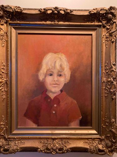 This is a mid-20th-century oil on canvas portrait depicting a young child with blonde hair, executed by the artist A. Blecka circa 1974. The subject is rendered in a bust-length pose, wearing a distinct reddish-crimson collared shirt that harmonizes with the warm, auburn-toned monochromatic background. The artist utilizes soft, expressive brushwork to define the child's features, creating a gentle and somewhat ethereal aesthetic. The lighting appears focused on the subject's face and bright blonde hair, providing a soft contrast against the darker recessed background elements. The piece is housed in a substantial and ornate gilded wood or composite frame, which features intricate Rococo-style scrolling, acanthus foliage, and floral flourishes at the corners and midpoints. The frame's finish exhibits a rich gold patina with some visible darkening in the recesses, characteristic of age. The overall construction suggests a high level of craftsmanship consistent with formal 1970s portraiture. Condition-wise, the canvas appears stable with minor surface dust, while the frame shows some typical wear along the edges but retains its structural integrity. The use of warm tones throughout the composition lends a nostalgic and intimate quality to the artwork.