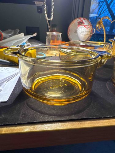 This item is a vintage Visions by Corning amber glass casserole dish, likely the 1.5-pint or 1-liter size variant. The dish is constructed from a specialized transparent glass-ceramic material known as Calexium, which is characterized by its deep honey-amber hue. The design features a circular body with two integrated 'lug' style handles on opposite sides for ease of lifting. The rim is specifically flanged To accommodate a matching glass lid, which appears to be missing in this instance. Structurally, the piece shows a slightly tapered profile leading to a flat base. In terms of condition, the glass retains its high-gloss transparency, though minor surface scratches and 'flea bites' consistent with kitchen use are visible upon close inspection, particularly on the interior floor of the vessel. The craftsmanship represents the late 20th-century aesthetic of functional, stovetop-to-oven cookware. This specific line was predominantly produced in the 1980s and 1990s in France or the USA. The material is renowned for its thermal shock resistance and non-porous surface, which prevents food odors and stains from lingering. There are no significant cracks or large chips visible in the photo, suggesting it remains in good vintage condition.