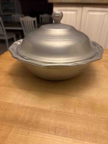 This is a vintage covered serving dish, likely constructed from pewter or cast aluminum, featuring a matte, satin finish characteristic of mid-20th-century metalware. The item consists of two main pieces: a deep circular base and a high-domed lid. The base features a distinctive scalloped or gadrooned rim that extends outward, providing both a decorative flourish and a practical grip surface. The lid is designed with a stepped, domed profile and is topped with a simple, rounded finial knob. Two concentric incised lines encircle the lid, adding a subtle geometric detail to the otherwise smooth surface. The metal displays a consistent grey patina throughout, with visible surface wear including fine scratches, minor pitting, and light scuffing consistent with domestic use and age. There are no immediate signs of deep denting or significant structural repairs, though slight irregularities in the rim suggest the soft nature of the metal alloy. This style is closely associated with American Colonial Revival or Mid-Century traditional aesthetics, likely dating from the 1940s to the 1960s. The craftsmanship indicates a utilitarian yet elegant mass-produced kitchenware item designed for heat retention and tabletop presentation. While no maker's mark is visible on the exterior, pieces of this design were commonly produced by mid-market metalware companies such as Wilton Columbia or similar regional foundries.