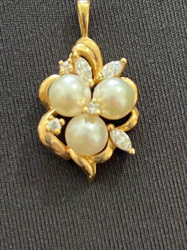 This is a fine jewelry pendant featuring a cluster of three round cultured pearls, likely Akoya, approximately 6-7mm each. The pearls possess a cream-white body color with a soft rose overtone and high luster. They are set within a decorative 14k yellow gold openwork frame characterized by fluid, swirling ribbon-like motifs. Accenting the pearls are two marquise-cut diamonds and three small round brilliant-cut diamonds, all prong-set. The marquise diamonds are strategically placed to suggest floral leaves, while the round diamonds act as 'dewdrops' within the gold swirls. The piece is topped with a simple polished tapered bail for suspension from a chain. The craftsmanship reflects a late 20th-century aesthetic, possibly 1980s or 1990s, where traditional materials like pearls were commonly combined with yellow gold and marquise accents. Overall condition appears excellent with no visible chips to the stones or significant nacre loss on the pearls; the gold exhibits a smooth, high-polish finish with only minor surface micro-scratches consistent with light wear. The setting is robust, indicating high-quality commercial manufacture.