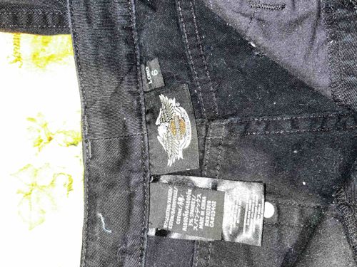 This item consists of a pair of black denim lifestyle pants produced by Harley-Davidson MotorClothes. The garment is constructed from a blend of 97% cotton and 3% spandex, as indicated by the interior care label, which provides a flexible fit. The interior waistband features multiple sew-on tags: a size tag denoting '6 LONG,' a primary brand tag featuring the iconic Harley-Davidson 'Bar & Shield' logo flanked by eagle wings, and a secondary care/manufacturing label. The manufacturing label specifies the item was 'Made in China' and provides RN#103819 and CA#03402. The fabric is a heavy-duty black twill denim with visible structural topstitching along the waistband and seams. The condition appears fair to good used condition, showing significant surface lint, dust accumulation, and minor fading characteristic of laundered black cotton textiles. No major structural damage such as tears or fraying is immediately visible in this interior view. The style reflects a contemporary era, likely manufactured within the last 10 to 15 years, aimed at the motorcycle enthusiast lifestyle market. The stitching is uniform, suggesting standard commercial mass-production quality.
