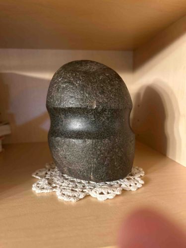 This item is a prehistoric full-grooved stone axe head, a tool likely dating from the Archaic period of North America (approx. 8000 to 1000 BCE). The object is crafted from a dense, dark igneous or metamorphic stone, such as basalt or diorite, exhibiting a fine-grained texture. It features a distinctive, deep concave groove that completely encircles the midsection, designed for secure hafting to a wooden handle using animal sinew or plant fibers. The stone shows evidence of extensive pecking and grinding to achieve its rounded, symmetrical form. The surface displays a dark charcoal to brownish-black patina consistent with long-term burial or environmental exposure. Physically, it possesses a rounded poll (butt) and a tapered bit (cutting edge), though the edge appears dulled from age or use. Condition-wise, there are minor surface pits and superficial scuffs, but the integrity of the stone remains solid with no significant fractures or modern chips. The craftsmanship is high, indicating significant labor and skill in shaping such hard material without metal tools.