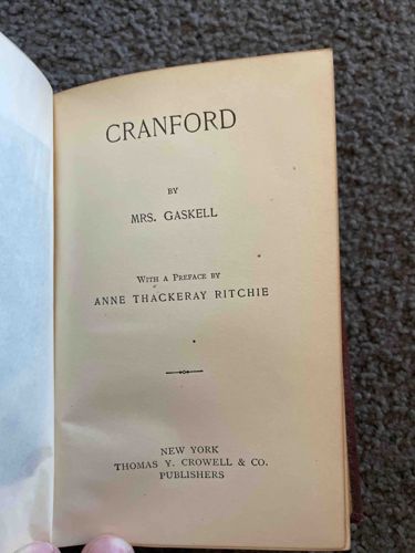 This is an antique hardcover edition of 'Cranford' written by Mrs. Gaskell (Elizabeth Gaskell). The title page indicates this specific edition features a preface by Anne Thackeray Ritchie and was published in New York by Thomas Y. Crowell & Co. Based on the publisher's history and the typography, this volume likely dates from the late 19th to early 20th century (circa 1890-1910). The paper displays significant age-toning, transforming from its original white to a distinct cream or pale tan hue, which is characteristic of the wood-pulp paper used during that era. The title page is printed in black ink with clean, serif typography and minimalist decorative elements, including a small horizontal flourish. The binding visible on the right edge appears to be a dark reddish-brown cloth. Physical condition notes include noticeable foxing or spotting on the title page, particularly small dark brown specks. The edges of the paper show some minor wear and softening, but the text blok remains intact. There are no immediate signs of modern repairs or restoration. The inclusion of Anne Thackeray Ritchie’s preface is a notable feature, as she was a well-known literary figure of the Victorian period. The craftsmanship reflects typical mass-market quality for refined literary editions of the late Victorian or Edwardian period.
