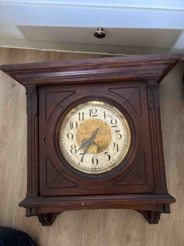 This is a vintage or antique box-style mantel clock, likely of American or European manufacture dating from the late 19th century to the early 20th century. The case is constructed from a dark-stained wood, possibly oak or walnut, featuring a prominent crown molding at the top and a decorative bracket base. The face of the clock is circular with a brass or gilt bezel, showcasing a two-tone dial. The outer chapter ring has printed Arabic numerals in a stylized font, while the center of the dial features an ornate, embossed golden-tone floral or filigree pattern. The hands are black, decorative spade or cathedral style. The wooden case door includes incised geometric line work at the corners and a visible keyhole on the left side, indicating a hinged access point for winding and maintenance. Architecturally, the clock features fluted pilasters on the left and right sides topped with carved floral rosettes, echoing the Eastlake or Neoclassical revival styles. The condition appears to be fair to good for its age, showing visible scuffs and scratches on the wooden finish, particularly along the top edge and base. There is some minor discoloration on the dial, and the wood finish shows expected signs of aging and wear. No specific maker's mark is visible on the exterior, but it follows the design language of major manufacturers from the period like Seth Thomas, Ansonia, or Waterbury.