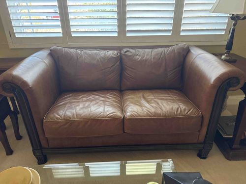Traditional Leather Rolled-Arm Loveseat with Exposed Wood Frame