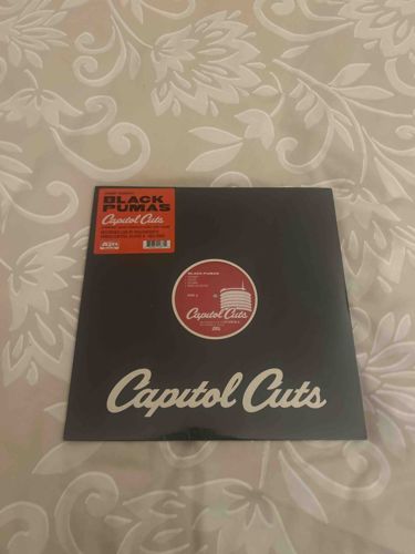 This item is a 12-inch vinyl record album by the soul group Black Pumas, titled 'Capitol Cuts (Live from Studio A)'. Released in 2021 by ATO Records, the album is presented in its original factory-sealed shrink wrap, indicating a Mint (M) or Near Mint (NM) condition for both the sleeve and the media. The outer sleeve is a sleek, black die-cut jacket featuring a circular window that reveals the red and white Capitol Records-style center label. A prominent red hype sticker is affixed to the top left corner of the plastic wrap, providing the band name, album title, and recording details ('Recorded Live at Legendary Capitol Studio A, Hollywood, CA'). The sticker also includes the record label logo and a barcode. The central label on the disc lists the tracklist for Side A, including 'Colors', 'Fire', and 'Confines'. The overall craftsmanship reflects high-quality contemporary vinyl production intended for collectors, featuring retro-inspired aesthetics that pay homage to the classic Capitol Records design of the mid-20th century. The item appears to be in pristine condition with no visible corner dings, seam splits, or tears in the original plastic seal.