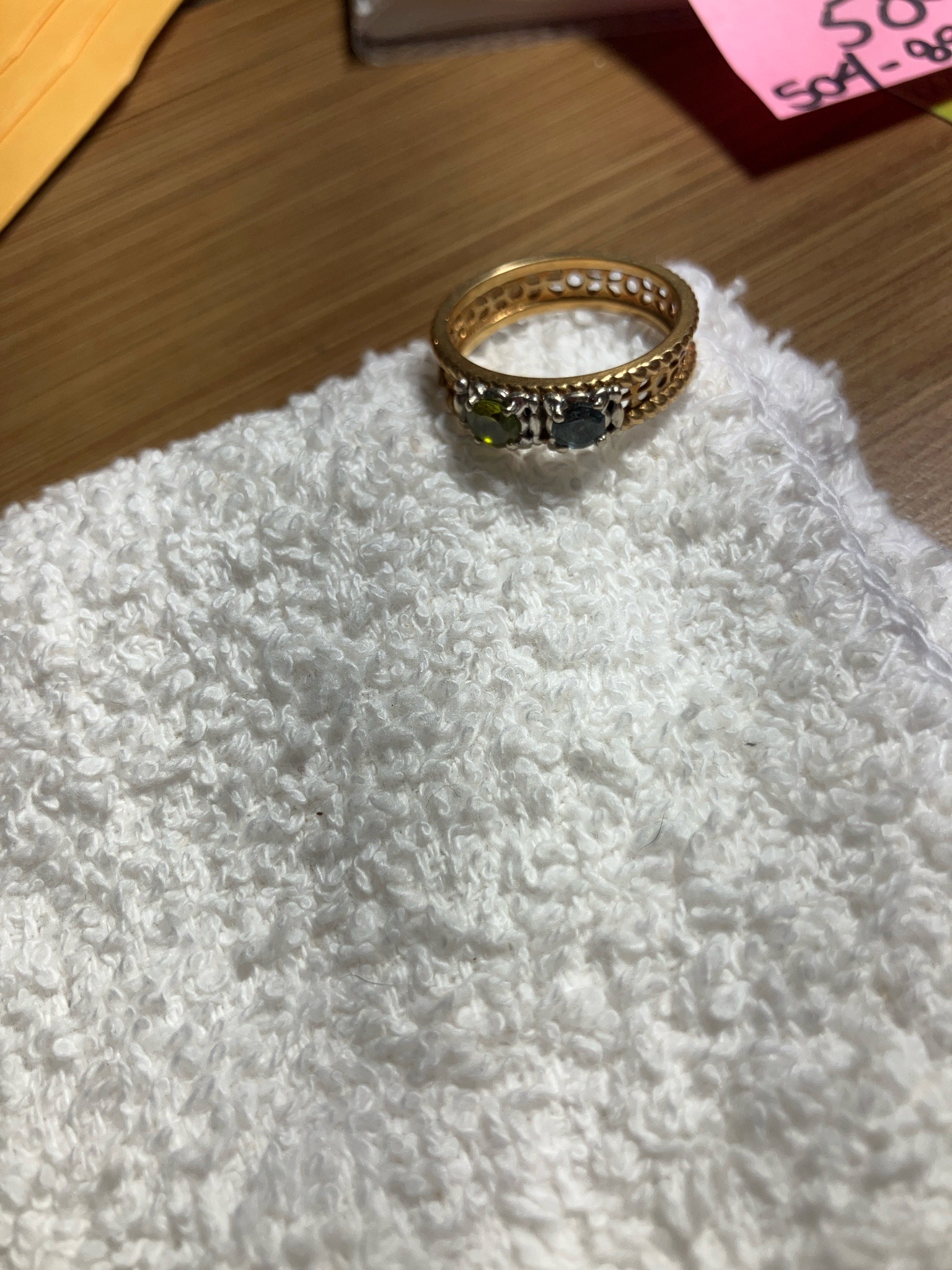 This is a contemporary two-tone dress ring featuring a highly detailed gallery and band design. The piece is constructed with a yellow gold band that incorporates an openwork, pierced gallery with circular cutouts for light penetration under the stones. The top of the ring features three round-cut gemstones: a central dark blue stone (possibly sapphire or spinel), flanked by a yellowish-green stone (likely peridot) and a third stone partially obscured but appearing to match the deep blue hue. The stones are set in four-prong white metal settings, creating a two-tone aesthetic. The external circumference of the band is embellished with a decorative bead or rope-style border. The craftsmanship suggests a commercial production from the late 20th or early 21st century. Condition appears fair to good; there is visible surface grime and accumulation behind the gemstones and within the intricate gallery, which may dull the stones' brilliance. The metal shows minor surface abrasions consistent with regular wear. No clear maker's marks or hallmarks are visible from the exterior angle, but the quality of the prongs suggests a mid-tier jewelry piece.