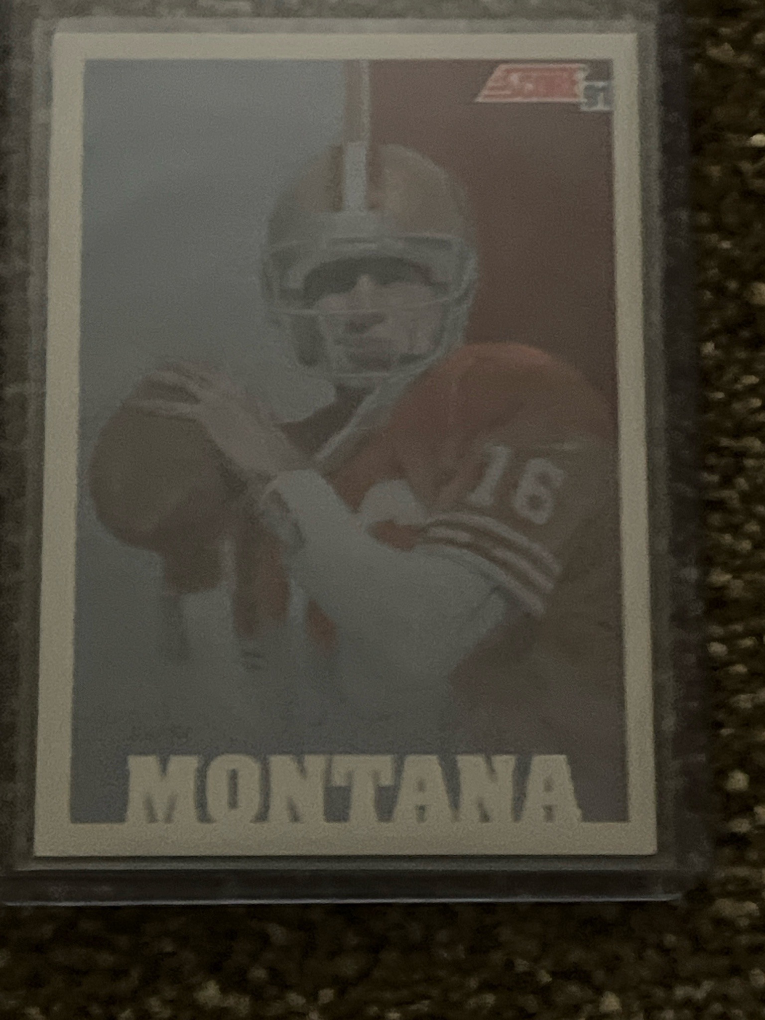 This is a 1991 Score football trading card featuring Hall of Fame quarterback Joe Montana of the San Francisco 49ers. The card follows the standard 2.5 by 3.5-inch format and is constructed from glossy cardstock. The front of the card utilizes a dual-tone background (gray and red) with a central action photograph of Montana in his red #16 jersey and gold helmet, preparing to pass. The 'Score 91' trademark logo is visible in the top right corner, while the player's name, 'MONTANA', is printed in large, bold white block lettering along the bottom edge. This particular specimen is housed in a protective semi-rigid clear plastic top-loader, which is standard for preserving collectible condition. The centering on the card appears slightly shifted toward the top edge, though the white borders remain relatively clean. The image quality shows a slight desaturation characteristically seen in some early 90s mass-produced print runs. No significant corner wear or surface creasing is immediately visible through the protector, though minor softening typical of 30-year-old cardboard might be present upon microscopic inspection. The 1991 Score set is widely recognized for its vibrant color palettes and large checklists from the pinnacle of the sports card hobby boom era.
