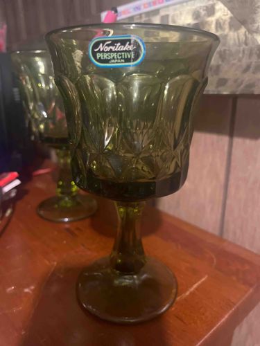 This is a vintage Noritake pressed glass goblet in the 'Perspective' pattern, specifically the dark olive or avocado green colorway. The piece stands approximately 6 inches tall and features a heavy, thick-walled construction characteristic of high-quality Japanese glassware from the mid-to-late 20th century. The design features a distinctive diamond-point or hobnail-style pattern around the lower half of the bowl, transitioning into smooth, arched flutes toward the flared rim. The stem is faceted and hexagonal, leading down to a circular, slightly domed foot. A key value indicator is the original blue and white oval foil manufacturer's sticker still affixed to the rim, which reads 'Noritake PERSPECTIVE JAPAN,' suggesting the item's provenance and potentially little to no prior use. The glass shows excellent clarity with no visible chips, cracks, or clouding from hard water, maintaining its original lustrous finish. The 'Perspective' line was produced roughly between 1970 and 1983, embodying the Mid-Century Modern aesthetic with its geometric textures and bold, earthy tones. The craftsmanship is evident in the crisp edges of the molded pattern and the balanced weight of the vessel.