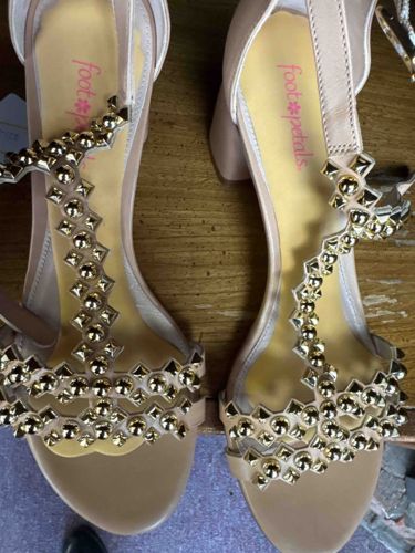 A pair of contemporary women's T-strap sandals featuring a light beige or nude-colored synthetic or leather upper. The most prominent design element is the heavy embellishment of polished gold-tone hardware along the T-strap and the double toe straps. These embellishments consist of a repeating pattern of pyramid-shaped studs and domed circular rivets, creating a textured, metallic aesthetic. The shoes feature a moderate-height block heel, which provides stability and suggests a modern, practical design suitable for evening or dressy day wear. Decorative yellow cushioned insoles are visible, bearing the 'Foot Petals' brand logo in pink script, accompanied by their signature flower graphic. Foot Petals is primarily known for footwear comfort inserts, suggesting these may be a collaborative footwear line or an instance where brand-specific cushions have been added post-purchase. The construction shows neat stitching along the straps and a clean almond-shaped toe bed. Condition-wise, the shoes appear to be in good pre-owned condition with some light wear visible on the internal toe area and slight creasing of the material on the ankle straps. The gold-tone hardware remains bright with no obvious missing studs or significant tarnishing. These sandals represent a modern-glam style typical of the 2010s to the present, focusing on the 'rockstud' aesthetic popularized by luxury fashion houses.
