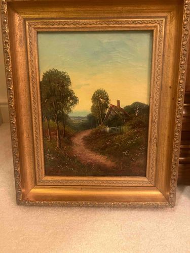 This is a small-scale original oil painting, likely on canvas or board, depicting a tranquil pastoral landscape. The composition features a winding dirt path leading the eye into a valley toward a cottage nestled among dense trees with a visible chimney. The sky is rendered in soft blues and yellow tones, suggesting late afternoon or early evening light. The brushwork in the foreground depicts wildflowers and dense foliage with varied textures. The piece is housed in a substantial wooden frame with a gold-toned or gilded finish. The frame features a decorative outer border with a continuous bead-and-scroll motif, leading to a smooth, sloped cove and a beaded inner liner. The frame shows some signs of age-related wear, including minor scuffing and small losses to the gilt finish, particularly along the outer edges and corners. Based on the style and framing, the piece likely dates from the late 19th to early 20th century. While no signature is immediately visible in the lower corners, the work demonstrates a competent use of light and perspective indicative of a practiced artist from the European or American landscape school. The overall condition appears stable, though the surface may benefit from professional cleaning to remove accumulated dust and oxidation.
