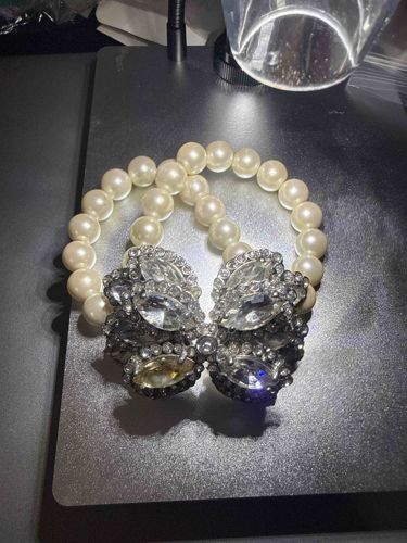This item is a piece of costume jewelry featuring a double-strand of cream-colored faux pearls connected by a large, ornate central bow motif. The bow is heavily embellished with clear and slightly yellowed marquise-cut rhinestones, each surrounded by a halo of smaller round-cut pavé crystals. The metallic base for the rhinestones appears to be a silver-tone alloy, possibly rhodium or nickel-plated, which shows signs of tarnishing and oxidation consistent with age. The faux pearls exhibit a high-luster nacreous coating, though close inspection reveals minor surface abrasions and some peeling typical of mid-20th-century costume beads. Construction-wise, the pearls are strung on a semi-flexible cord, possibly elastic or multi-strand wire, suggesting a stretch-style fit for various wrist sizes. The central bow serves as both a decorative focal point and a structural bridge for the two strands. There are no visible maker's marks or signatures on the reverse of the setting shown, but the style is reminiscent of mass-produced glamour jewelry from the 1950s to 1980s. Notable condition issues include a slight yellowing of the adhesive used to secure the larger stones and some dulling of the smaller decorative crystals, which may indicate moisture exposure or natural aging of the foil backing.