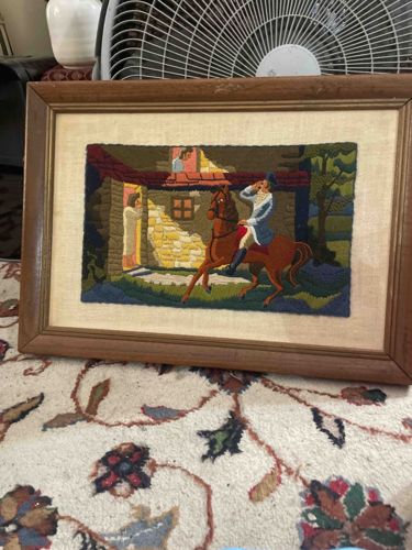 This item is an antique or vintage framed needlepoint tapestry depicting a colonial scene, likely intended to represent Paul Revere’s midnight ride. The central image features a gentleman in blue and white 18th-century revolutionary-period military attire mounted on a brown horse, appearing to alert residents of a stone cottage. The artwork is hand-stitched using wool or cotton yarns on a canvas backing. The color palette is rich and diverse, featuring deep blues, earthy greens, reds for the roof tiling, and ochre for the cottage walls. The stitching demonstrates consistent tension and detail, particularly in the rendering of the landscape and the figure's posture. The piece is mounted on a light-colored linen or burlap matting and housed in a simple, rectangular wood frame with a dark cherry or walnut finish. Measuring approximately 12 by 18 inches, the piece appears to date from the mid-20th century, a period when historical motifs were popular in home hobby crafts. Condition-wise, the frame shows some minor surface abrasions and light dust accumulation. The needlepoint itself appears well-preserved with minimal fading or pulled threads, though the surrounding fabric mat shows slight discoloration consistent with age. There are no visible maker's marks or signatures on the face of the work, which is common for such artisanal domestic pieces.