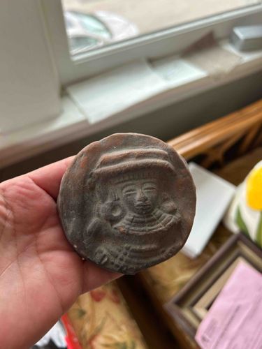This item is a circular relief plaque or disk, likely crafted from reddish-brown terracotta or earthenware clay. It measures approximately 3 to 4 inches in diameter and fits comfortably within the palm of a hand. The central motif features a low-relief carving of a human figure, possibly a deity or an individual of high status, rendered in a style reminiscent of Mesoamerican Pre-Columbian art, such as Maya or Aztec traditions. The figure is depicted wearing an elaborate headdress, large ear spools, and a wide, tiered collar or necklace. The facial features are stylized with almond-shaped eyes and a stoic expression. The construction appears to be molded or hand-carved, with visible tool marks in the recessed areas. The material shows a dark, earthy patina with lighter red-clay undertones visible in areas of higher relief. Notable condition issues include irregular, chipped edges and surface abrasions consistent with age or simulated weathering. The texture of the clay appears porous and matte, without any visible glazing. While it mimics ancient artifacts, the lack of a formal provenance or specific maker's marks makes it difficult to distinguish between an authentic archaeological find and a 20th-century artisan reproduction intended for the tourist trade or decorative use. The craftsmanship demonstrates attention to iconographic detail, particularly in the symmetrical rendering of the traditional garments and accessories.