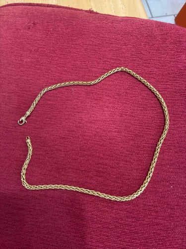 This item is a yellow gold chain necklace, approximately 18 to 20 inches in length, featuring a complex wheat (spiga) link construction. The wheat style is characterized by four strands of twisted oval links woven together to create a braided, symmetrical appearance that resembles a stalk of grain. The metal displays a bright, high-polish yellow hue consistent with 14k or 18k yellow gold. The necklace is secured with a functional lobster claw clasp and a rounded end cap. The craftsmanship shows tight, consistent weaving without visible gaps or kinks, indicating a high level of manufacturing quality. While no specific maker's marks are legible in the image, the style is a classic staple of late 20th-century to contemporary fine jewelry. The condition appears excellent with no noticeable stretching of the links or heavy surface scratches. The overall weight and flexibility suggest a solid gold construction rather than a hollow shell, though a physical measurement would be required to confirm karat weight and density. This piece represents a timeless, versatile jewelry design popular for its durability and aesthetic appeal.