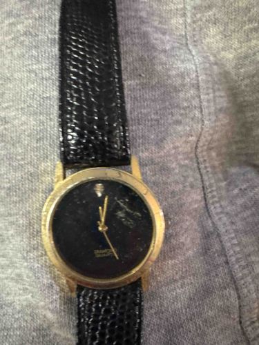 This is a circular wrist watch featuring a gold-tone metallic case, likely composed of base metal with a thin gold-colored plating. The watch face is a deep, solid black with a minimalist design, lacking numerical markers. Instead, it features a single decorative element, likely a small crystal or diamond chip, positioned at the 12 o'clock mark. The watch hands are gold-toned and includes a thin second hand. Text on the bottom of the dial indicates 'DIAMOND' and 'QUARTZ', suggesting it is battery-powered. The case shows visible signs of wear, including minor scratches, scuffing on the bezel, and potential plating loss near the lugs. The glass crystal exhibits significant smudging or internal clouding and several surface scratches. It is paired with a black synthetic or genuine leather strap with an embossed lizard-skin texture. The construction is typical of mass-produced fashion watches from the late 20th century, approximately the 1980s or 1990s. The overall condition is fair to used, with dullness in the metal finish and noticeable debris on the face protector.