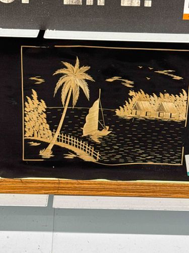 This rectangular artwork features a tropical island landscape composed of meticulously applied natural organic material, likely wheat straw or bamboo husks, mounted on a solid black fabric or paper background. The scene depicts a prominent palm tree on a shoreline, a traditional sailboat (possibly a junk or proa) on the water, and small thatched-roof dwellings in the background. The golden-tan color of the straw creates a high-contrast, luminous effect against the dark matte field. Each element, from the individual fronds of the palm tree to the textured water ripples, is composed of slender, hand-cut strips of material, demonstrating skilled folk-art craftsmanship. The piece is enclosed in a narrow rectangular border of the same material. In terms of condition, there is visible rippling and minor warping of the backing material, suggesting potential moisture exposure or simple aging of the adhesive. The straw elements appear mostly intact, though there may be minor fraying at the edges. This style of artisanal 'straw painting' was a popular souvenir and decorative export from Southeast Asia or South America during the mid-to-late 20th century (circa 1960s-1980s).