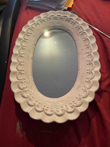 This item is an oval-shaped vanity tray featuring a central reflective glass mirror surrounded by a wide, elaborately decorated ceramic border. The ceramic frame is finished in a creamy off-white or light beige glaze with a glossy sheen. The border showcases a repetitive embossed motif consisting of scrolling filigree, fleur-de-lis-inspired accents, and beaded circular patterns, giving it a classic, neo-Baroque aesthetic. The outermost edge is scalloped, following the curves of the scrollwork. The glass mirror appears to be flush-set into the ceramic base. There are visible dust particles and light surface smudging on the mirror glass, common with use, but no significant silvering loss or deep scratches are immediately apparent from the angle. The ceramic work shows consistent molding quality typical of contemporary mass-produced decorative homewares, likely dating from the early 21st century. Measuring approximately 12 to 14 inches in length, this tray serves as a functional and decorative piece for organizing perfumes, jewelry, or cosmetics on a dresser or vanity table.