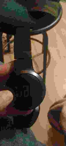This item is a pair of black, wireless on-ear headphones manufactured by JBL, part of their popular 'Tune' series. The headphones feature a matte black finish on the headband and earcups, with the iconic 'JBL' logo prominently embossed in a contrasting texture on the outer shell of the earphone. The construction appears to be primarily made of high-impact molded plastic for a lightweight design, likely incorporating a folding mechanism for portability. The ear cups are cushioned with synthetic leather (protein leather) padding to provide comfort during extended use. The headband is adjustable to accommodate different head sizes. Based on the visible design, these represent a modern portable audio style from the late 2010s to early 2020s. The condition shows some signs of handling and dust, though the logo remains crisp and clear. The ergonomics suggest a consumer-grade build focused on durability for daily commuting. Notable features include the integrated controls likely located on the rim of the earcup and a built-in microphone for hands-free calling. The overall craftsmanship is consistent with mass-produced electronic consumer goods, prioritizing functional utility and brand recognition.