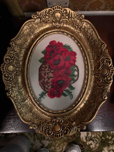 This item is an oval petit point tapestry or needlepoint piece featuring a vibrant floral arrangement of red poppies spilling out of a tan and brown woven basket. The artwork is executed on a fine-mesh white or cream-colored ground, utilizing a palette of deep reds, greens, and browns. The stitching appears dense and uniform, suggesting mid-20th-century craftsmanship, likely between 1940 and 1970. The embroidery is housed in a highly decorative, Rococo-style oval frame characterized by a faux-gold or gilded finish with an antiqued patina. The frame features ornate scrolled acanthus leaf motifs at the top, bottom, and sides, with a textured 'crackle' or stippled ground within the remaining surface. The frame is likely made of molded wood or a composite resin to simulate hand-carved ornamentation. Condition-wise, the tapestry itself appears well-preserved with no significant fading or staining visible. The frame exhibits minor surface wear and some darkening in the recessed areas, which may be intentional aging or accumulated dust. No maker's marks or signatures are visible in the photograph, though such markings are common on the back of the textile or frame backing in pieces of this era.