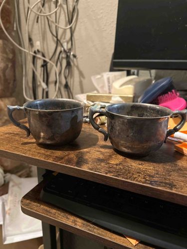 This set consists of two silver-plated hollowware vessels, likely a sugar bowl with double handles and a matching single-handled tea cup or bouillon cup. Based on the provided context of 'Taunton Mass EPNS', these pieces are manufactured by Reed & Barton, a renowned silversmith located in Taunton, Massachusetts. The EPNS stamp indicates 'Electroplated Nickel Silver,' meaning a silver coating was applied over a base of nickel silver. Physically, the items feature a bulbous, rounded body with ornate, scroll-style cast handles that exhibit a classic 20th-century aesthetic. They show significant atmospheric oxidation (tarnish) across the entire exterior and interior surfaces, resulting in a dark, mottled grey and blue-black patina. While this tarnish is reversible, the uneven surface coloration suggests the items have been stored in a high-sulfur environment for a long period. No major dents or deep structural fractures are immediately visible in the image, though close inspection might reveal micro-scratches from previous cleaning or usage. The craftsmanship is indicative of industrial mass production with good quality control typical of mid-20th-century American silver-plate manufacturers.