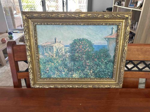 This item is an original oil or acrylic painting on canvas, housed in an ornate, gilded wood frame. The artwork is executed in an Impressionist style, characterized by short, thick brushstrokes that capture the essence of the subject rather than fine details. The composition features a Mediterranean-style coastal scene with two light-colored villas or houses partially obscured by lush, dense greenery and flowering trees. In the background, a sliver of vibrant blue sea meets a pale, hazy sky. The color palette is dominated by various shades of green, earthy yellows, ochre, and blues, with small pops of reddish-pink representing blossoms. The painting exhibits significant impasto, giving the surface a tactile, three-dimensional quality. The frame is a heavy, wide-profile wood molding with a metallic gold finish, featuring a complex foliate or laurel leaf vine pattern on the outer edge and a smooth cove inner liner. The frame shows some signs of age with minor cracking in the gilding and accumulated dust in the crevices, consistent with a mid-20th-century piece attempting a classical aesthetic. No visible signature is discernible in the provided image, though one may be present under the frame's lip. The overall condition appears stable with no major flaking or canvas punctures visible.