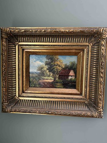 This item is a small-scale, traditional oil painting depicting a rural pastoral landscape featuring a small cottage or barn nestled among mature trees. The artwork is executed on a rigid support, likely a wooden panel or artist board, and exhibits a painterly, realist style reminiscent of 19th-century European landscape traditions. The composition uses a warm color palette with greens, ochres, and earthy browns, balanced by a bright blue sky with white cumulus clouds. The painting is housed in a substantial, deeply recessed gilded wood frame characterized by ornate neoclassical or baroque-style moldings. The frame features several distinct decorative bands, including a high-relief fluted or 'reeded' central section, a guilloché or chain-link pattern on the outer border, and stylized shell-and-leaf motifs at the corners. The gilding displays an aged gold finish with a visible dark patina in the recesses, suggesting it may be a cast resin or composite material finished with gold leaf or metallic paint. Condition-wise, the frame shows some minor chips and wear along the outer edges, revealing the substrate beneath. The painting itself appears well-preserved with no immediate signs of flaking or significant crazing, though a light layer of surface dust is present. While no signature is immediately visible in the lower corners, the craftsmanship suggests a mid-20th-century decorative piece intended to emulate an antique masterwork.