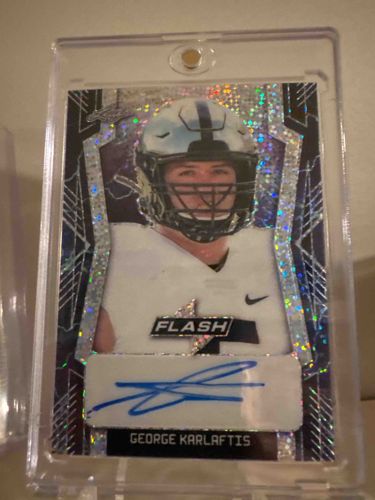 This is a modern sports trading card featuring George Karlaftis, likely from his rookie year, produced by Leaf Trading Cards under the 'Flash' product line. The card features a high-gloss, premium finish with a silver prismatic 'glitter' or 'ice' refractor border that reflects light in a spectrum of colors. The central image depicts Karlaftis in a white football jersey and a white-and-black helmet, framed within a stylized geometrical border. A significant feature is the authentic on-card autograph located at the bottom in bold blue ink, signed on a dedicated white sticker or window area. The card is presented in a hard plastic magnetic 'one-touch' holder, suggesting it is a high-value collectible. The physical condition appears excellent with sharp corners, clean edges, and vibrant colors, though the surface should be inspected for micro-scratches. The design utilizes a modern, tech-inspired aesthetic characteristic of 2020s sports card manufacturing, focusing on holographic elements and limited-edition appeal.