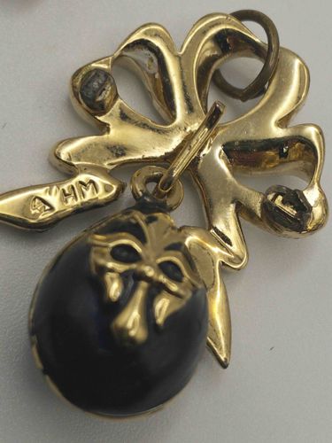 This is a vintage piece of costume jewelry featuring a polished gold-tone metal bow design with a suspended fob/charm. The bow is rendered in a flowing, three-dimensional style with a high-shine finish. Dangled from the center loop is a dark blue or black enameled egg-shaped charm, adorned with an applied gold-tone decorative filigree or cross-like overlay. The back of the bow clearly displays an 'HM' maker's mark within a recessed cartouche, alongside a small triangular hallmark, indicating it was likely produced by HL Miller. This specific brand is known for high-quality costume jewelry often sold at high-end department stores or through specialized boutiques. The piece features a pendant bail at the top but also shows remnants of a pin mechanism on the reverse, suggesting it may have been a convertible brooch/pendant. There is visible wear consistent with age, including light surface scratches on the metal, some dulling of the gold plating on the raised edges, and darkening (patina) on the connector ring and the interior of the bow’s loops. The enamel appears largely intact with a glossy finish, though there are slight signs of oxidation on the solder points where the pin back once attached. The craftsmanship is solid for mid-to-late 20th-century costume jewelry, with a weightiness and depth to the casting that distinguishes it from cheaper mass-produced items.