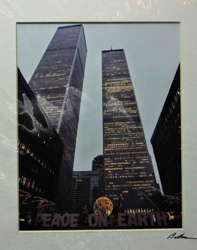 This item is a framed photographic print featuring the World Trade Center Twin Towers in New York City during the holiday season. The image is a vertical low-angle shot, capturing the towering presence of the North and South towers against a dim, overcast twilight sky. The towers are illuminated from within, creating a grid-like pattern of golden yellow light against the dark steel and glass facades. In the foreground, large block letters spell out 'PEACE ON EARTH,' positioned behind a golden spherical sculpture, likely 'The Sphere' by Fritz Koenig, which was a landmark of the WTC plaza. The print is matted in a white archival-style mat and features a handwritten signature in the lower right corner that appears to read 'Balthazar' or a similar cursive name. The color palette is dominated by cool blues, greys, and blacks, contrasted sharply by the warm amber glows of the building lights and the holiday decorations. The style is 20th-century architectural photography with a focus on urban symbolism. Condition-wise, the glass or acrylic covering shows significant surface smudging, glares, and some visible debris or scratches that may be on the protective layer rather than the print itself. The matting appears clean and well-preserved. Based on the subject matter, the original photograph was taken prior to September 2001, likely in the late 1980s or 1990s, capturing a poignant moment of pre-9/11 New York history.