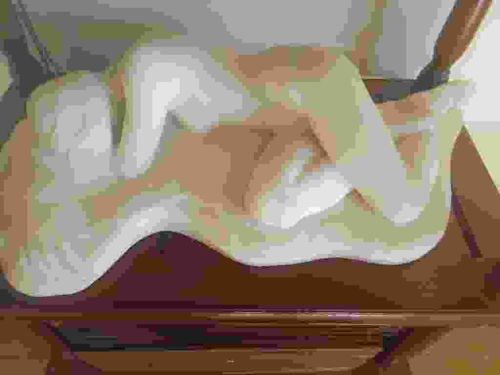 This item is an abstract, organic figurative sculpture carved from a high-quality white marble, likely Carrara or a similar fine-grained stone. The piece depicts a stylized or reclining female form, characterized by soft, rounded contours and flowing, curvilinear lines that emphasize the sensual nature of the medium. The stone's color is a creamy white with subtle natural veining that follows the curves of the carving, adding depth to the anatomical abstraction. The surface appears to have been polished to a smooth, matte or satin finish, providing a soft tactile quality typical of mid-20th-century modernism. The sculpture exemplifies a biomorphic style reminiscent of the works of Henry Moore or Jean Arp, focusing on the interplay between form and void. While the low-resolution image obscures specific maker's marks, the craftsmanship suggests a professionally trained sculptor with a deep understanding of negative space and balance. There are no immediate signs of major structural fractures, though a light natural patina is visible, and minor surface abrasions consistent with age and display on a wooden pedestal can be inferred. The piece likely dates from the 1950s to the 1970s and represents a period of intense exploration in semi-abstract stone carving.